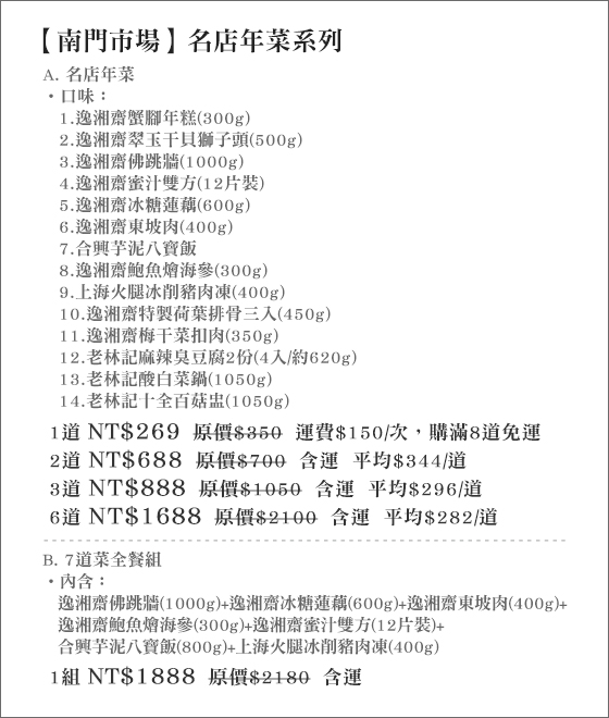 ![]() 台塑生醫-舒暢益生菌 售價:599 我要購買 台塑生醫-舒暢益生菌-為身體做環保!九種複合益生菌、三種順暢營養素、三包埋防護技術,三效合一,通暢每日好心情!平均每盒最低只要599元起(含運)即可購得【台塑生醫】舒暢益生菌1盒/2盒(4gx30包/ | ![]() 京兆尹.養生御膳-雙龍飛騰套膳/四季平安套膳 傳承中國正宗御膳手藝,重現帝王養生用膳飲食文化,品嚐名菜食材特製的宮廷風味饗宴! 售價:1480 我要購買 京兆尹.養生御膳-雙龍飛騰套膳/四季平安套膳-傳承中國正宗御膳手藝,重現帝王養生用膳飲食文化,品嚐名菜食材特製的宮廷風味饗宴!京兆尹.養生御膳 雙龍飛騰套膳/四季平安套膳 | ![]() 珍腸一生-香腸系列 售價:74 我要購買 珍腸一生-香腸系列-檔檔破千熱賣!你吃過了沒?採用100%自製純豬油塊,食用超安心!獨特傳統新滋味,口口皆是肥美鮮甜!只要74元起即可購得【珍腸一生】原價最高1600元香腸系列:(A)風味香腸1包(2 |