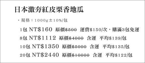 ALEX也請我幫忙收集該商品資料!我有去遍尋各大購物網站momo購物、yahoo奇摩購物、博客來、PChome線上購物、ibon mart搜尋優惠價格!最近我也在找日本激夯紅皮栗香地瓜的相關資訊~整理資訊大致有分享文、開箱文、試用文、評鑑文、推薦文、是否便宜、優缺點等資訊.到實際到銷售的EC去看,價格就有機會再便宜一些! |  | 日本激夯紅皮栗香地瓜-夯遍日本的紅皮栗香地瓜!無須剝皮可連皮一起吃,不浪費任何營養,甜香柔軟不乾柴的好口感,讓人吃不膩平均每包最低只要122元起(3包免運)即可購得日本激夯紅皮栗香地瓜1包/8包/10 售價:122