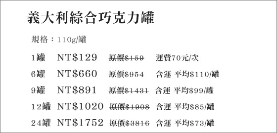 | 義式綜合巧克力罐-香醇濃滑的巧克力,絲絲入扣經典口感,入口即化的美味,感受到巧克力在唇齒間滑過,罐裝設計送禮自用兩相宜平均每罐最低只要73元起即可購得義大利綜合巧克力罐1罐/6罐/9罐/12罐/24罐 售價:73